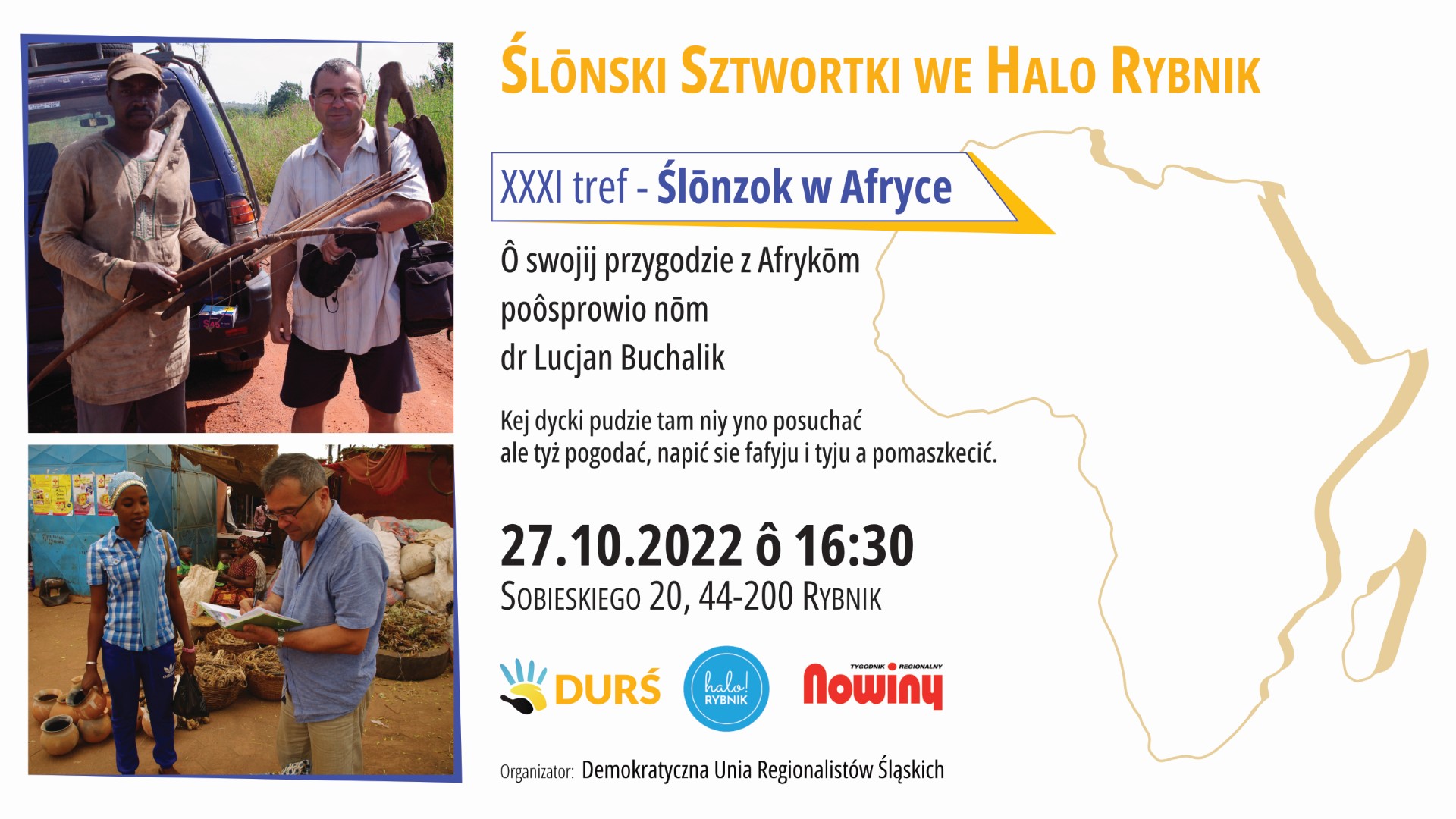 Ô swojij przygodach ze Afrykōm porozprowio nōm Lucjan Buchalik (ur. 1961), etnolog-afrykanista, muzealnik kustosz dyplomowany, Ślōnzok urodzony w Rybniku, zamieszkały w Rowniu (Żory). Skończył studia na Wydziale Filozoficzno-Historycznym Uniwersytetu Wrocławskiego w zakresie etnografii (1986). Ukończył trzy-semestralne studia podyplomowe na Wydziale Historycznym Uniwersytetu Warszawskiego w zakresie muzealnictwo (1997-99). Doktorat na Wydziale Historycznym UAM w Poznaniu (2008).