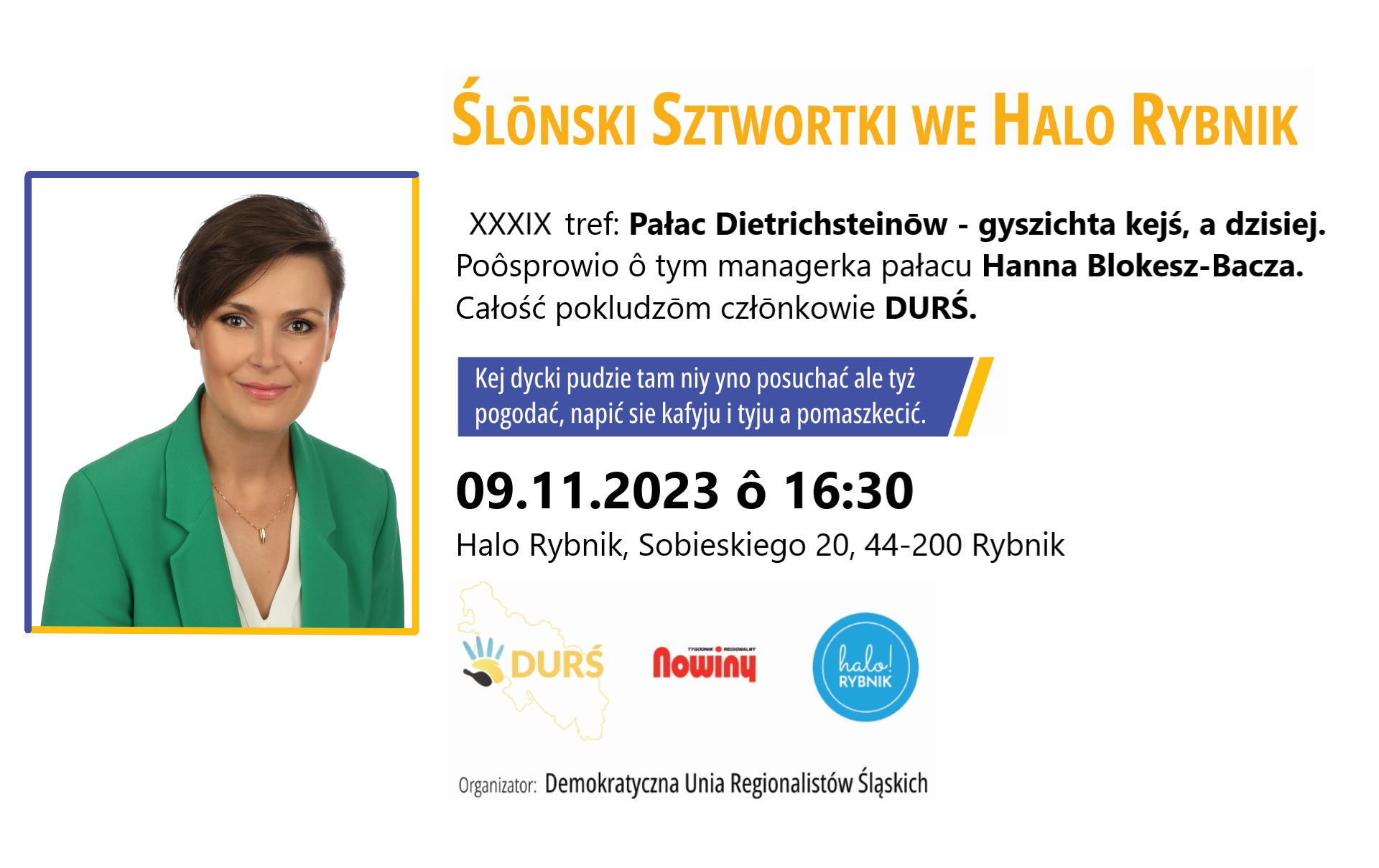 Wczoraj 9 listopada bōł XXXIX tref z seryji Ślōnski Sztwŏrtek we Halo Rybnik p.m „Pałac Dietrichsteinōw-gyszichta kejś, a dzisiej” a gościym trefu bōła menadżerka pałacu Hanna Blokesz-Bacza, kero poôsprawiała ô gyszichcie obiektu i jak dzisiej funguje jako Muzeum w Wodzisławiu Ślōnskim.