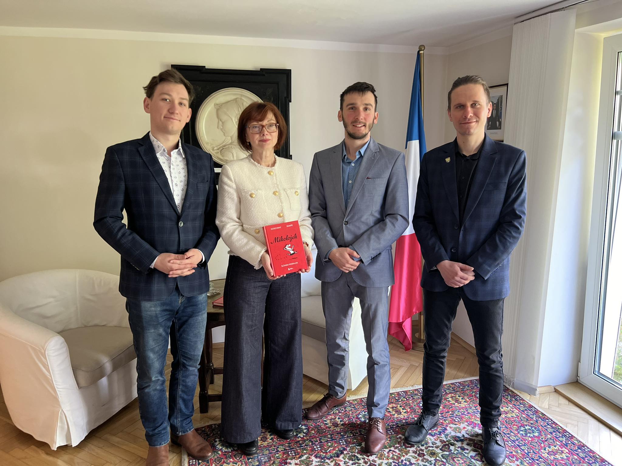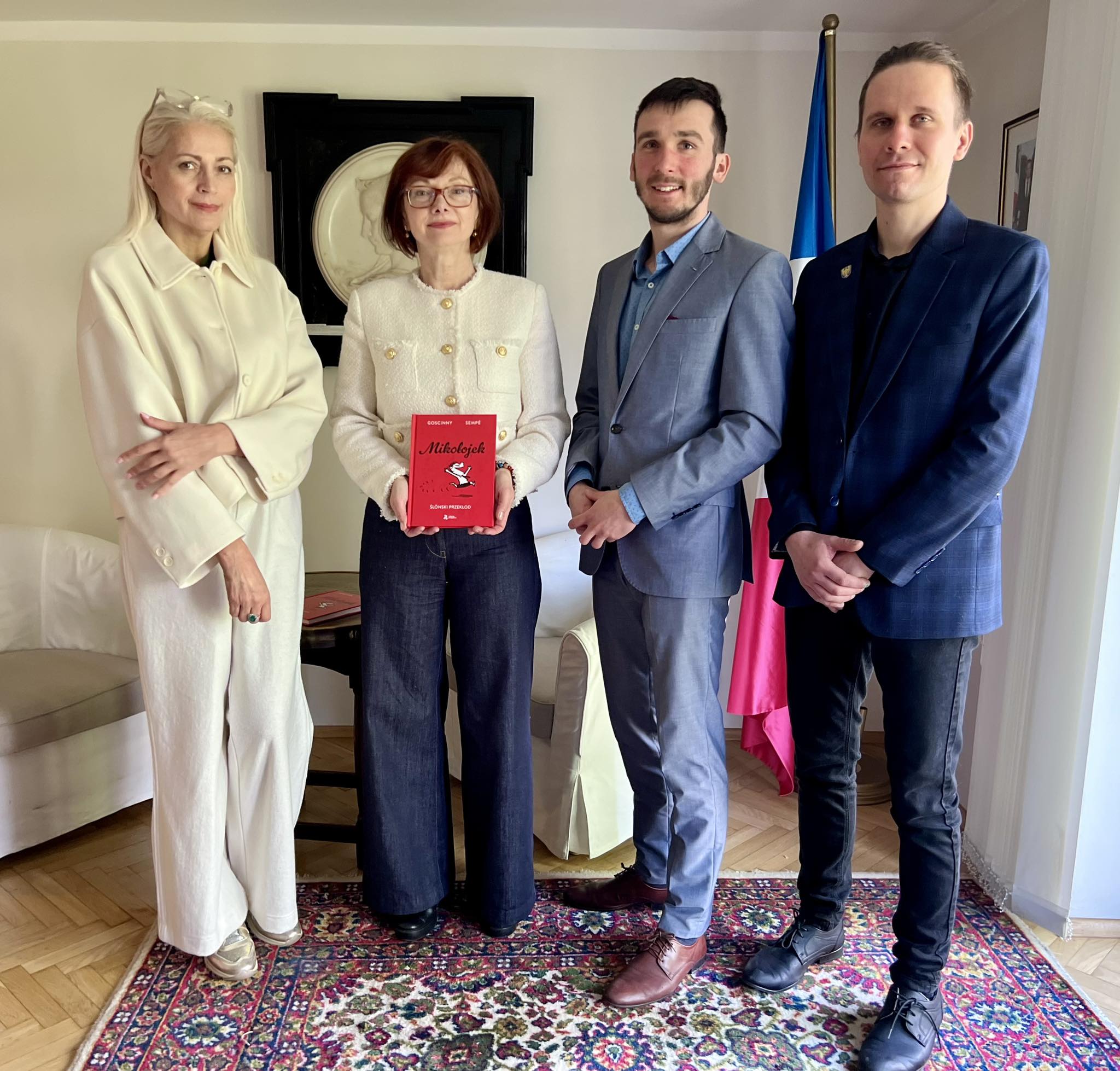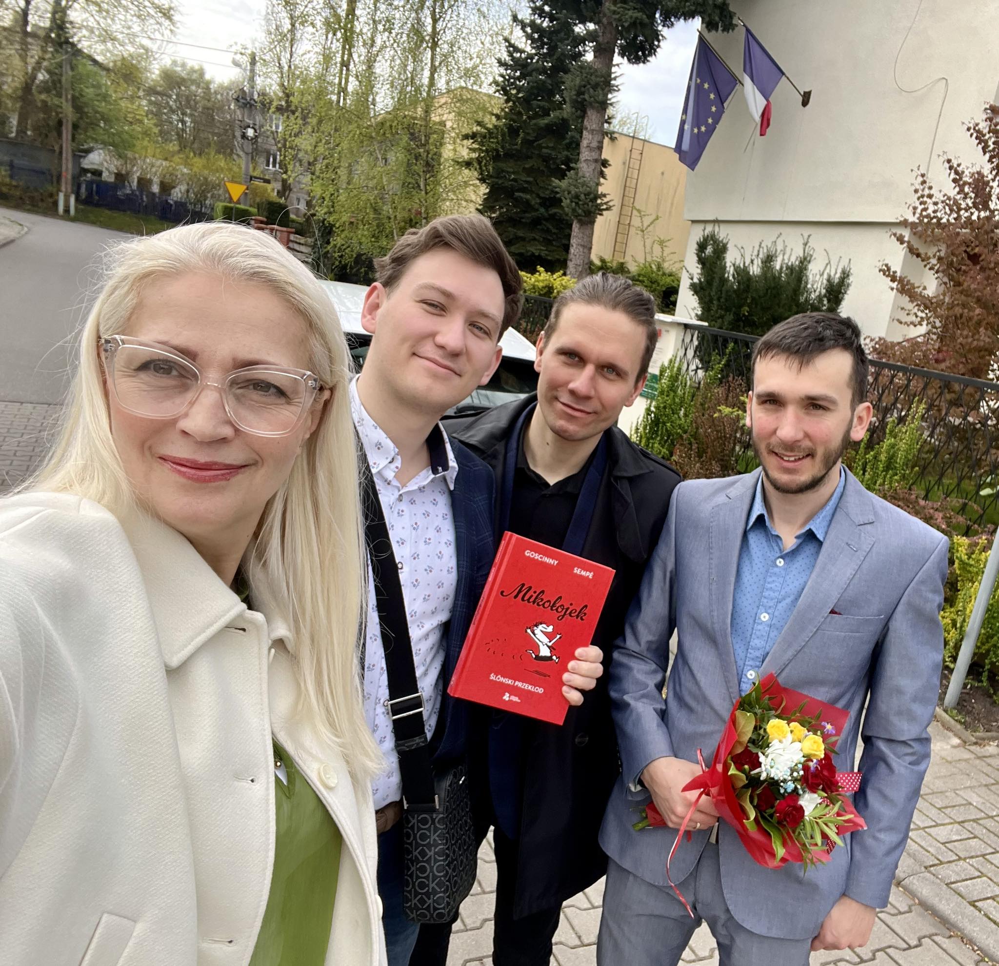 6 kwiytnia delegacyjo DURŚ bōła z byzuchym u Consul Honoraire de France à Katowice/ Konsul Honorowa Francji w Katowicach kaj ôsprowiali my ô ôstatnij ksiōnżce Grzegorza Buchalika „Mikołojek„, jak tyż jego nastympnym przekłŏdzie – Asteriks na szpilach ôlimpijskich. Pani Kōnsul była fest rada co klasyki francuskij literatury sōm przekludzane na ślōnskŏ gŏdka. Gŏdali my tyż ô prziszłości jynzyka ślōnskigo i robocie, kero naszo ferajna ônaczy już bez mocka lat.