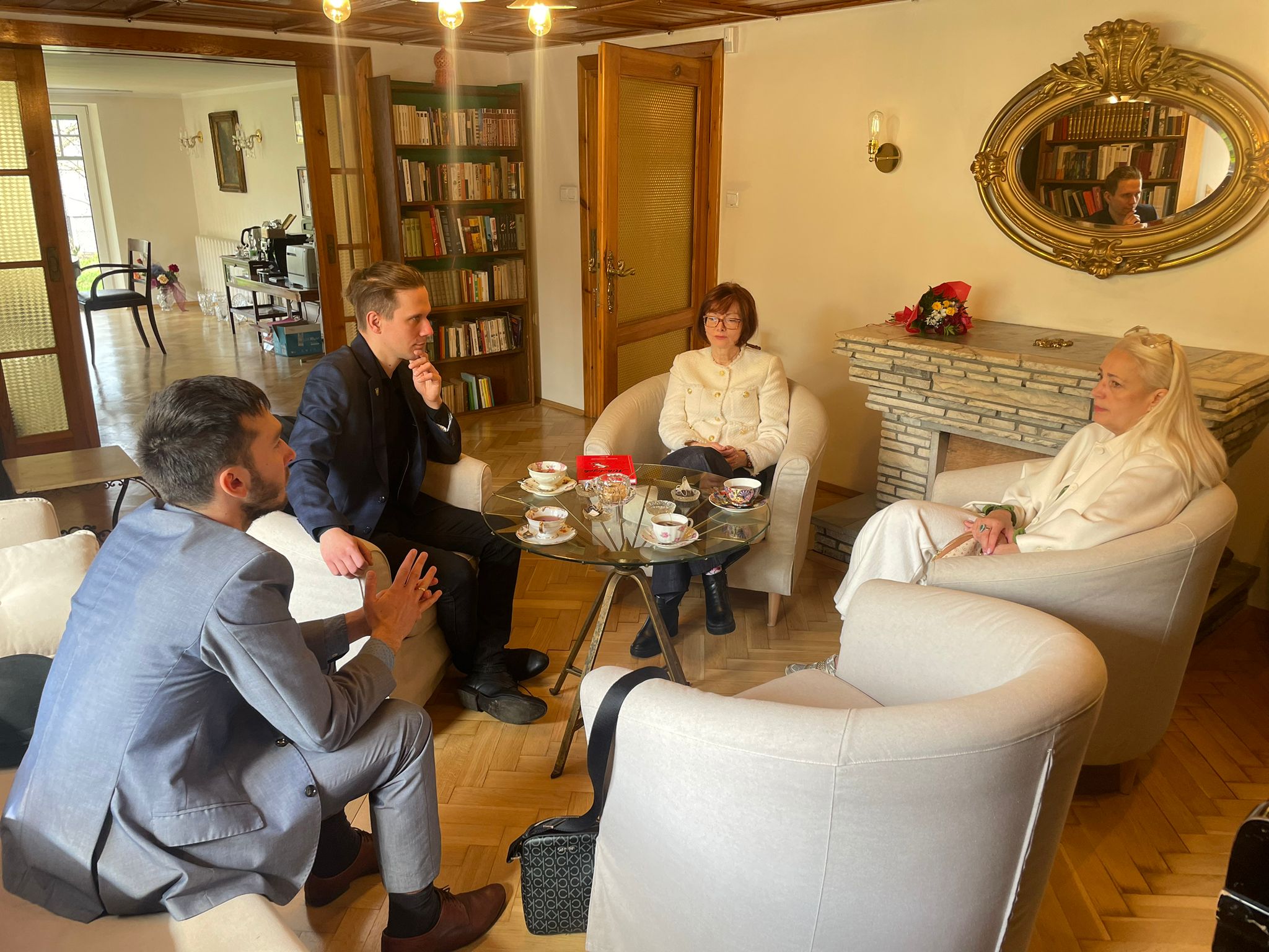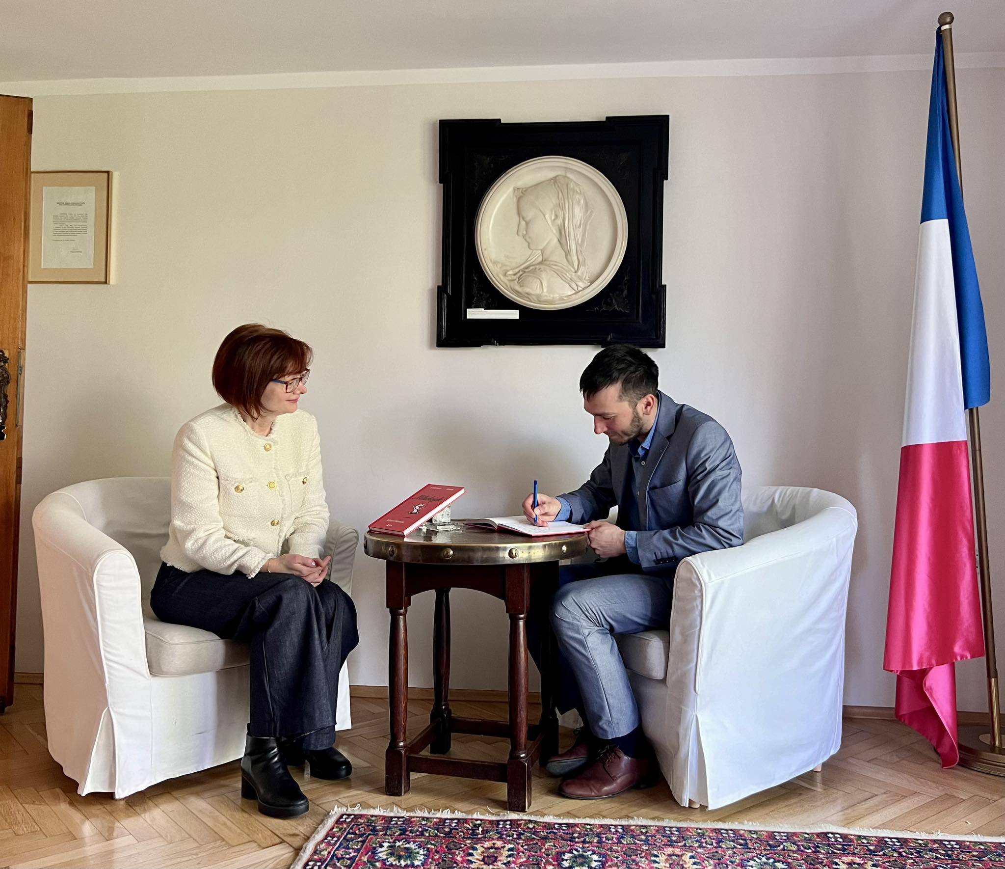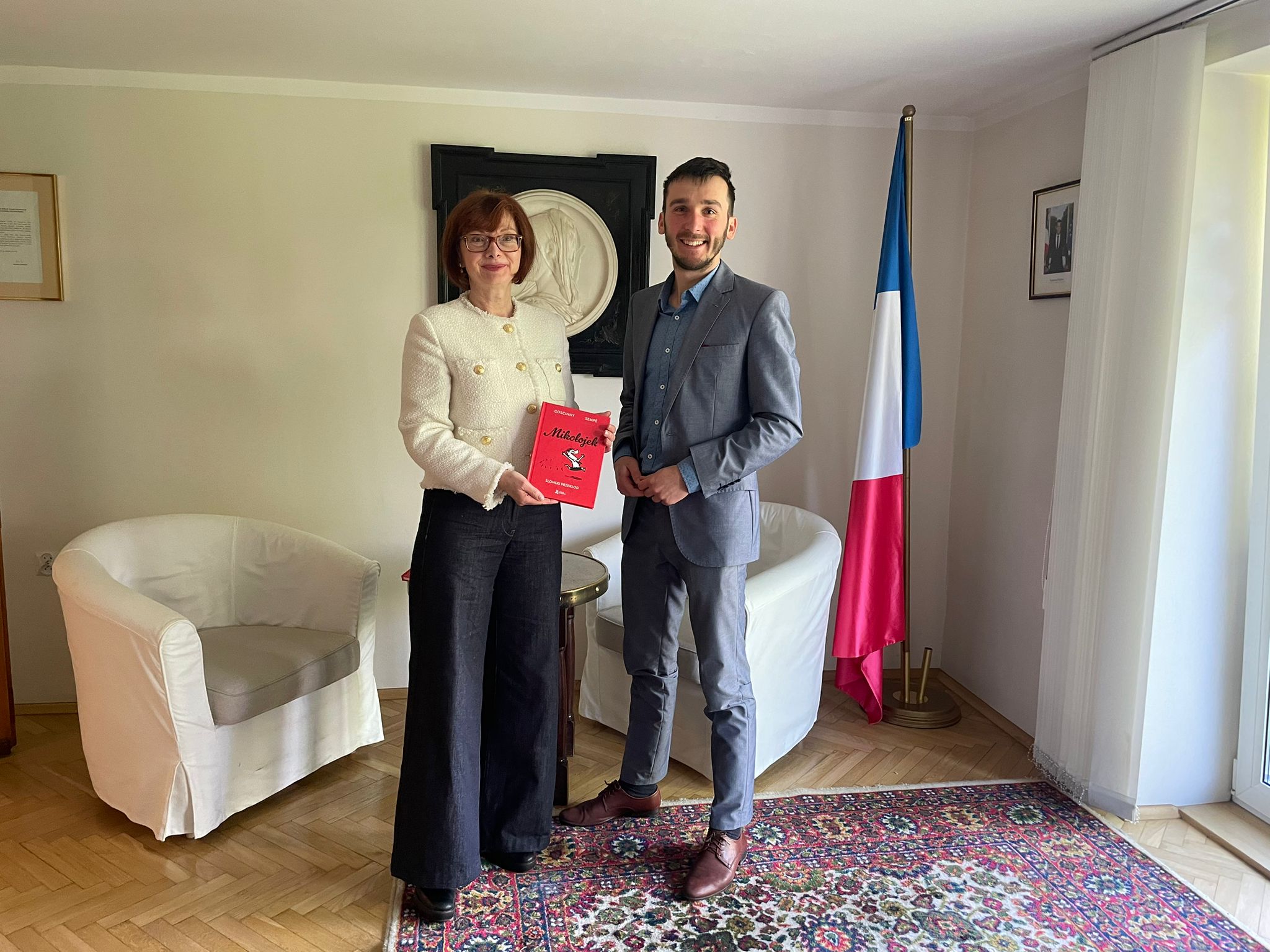 6 kwiytnia delegacyjo DURŚ bōła z byzuchym u Consul Honoraire de France à Katowice/ Konsul Honorowa Francji w Katowicach kaj ôsprowiali my ô ôstatnij ksiōnżce Grzegorza Buchalika „Mikołojek„, jak tyż jego nastympnym przekłŏdzie – Asteriks na szpilach ôlimpijskich. Pani Kōnsul była fest rada co klasyki francuskij literatury sōm przekludzane na ślōnskŏ gŏdka. Gŏdali my tyż ô prziszłości jynzyka ślōnskigo i robocie, kero naszo ferajna ônaczy już bez mocka lat.